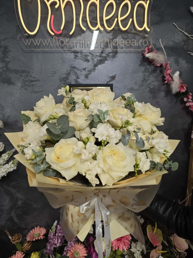 Acest buchet MIRIFIC poate sa contina : 15x Trandafiri CandleLight, 16x Frezii Albe, 6x Eucalipt, ambalaje si fundita plus o felicitare(inclusa in pret) pentru a scrie mesaul dumneavoastra.