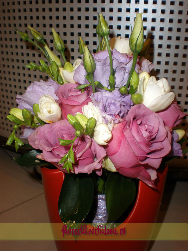 Buchet de mireasa cu trandafiri albi si trandafiri lila
