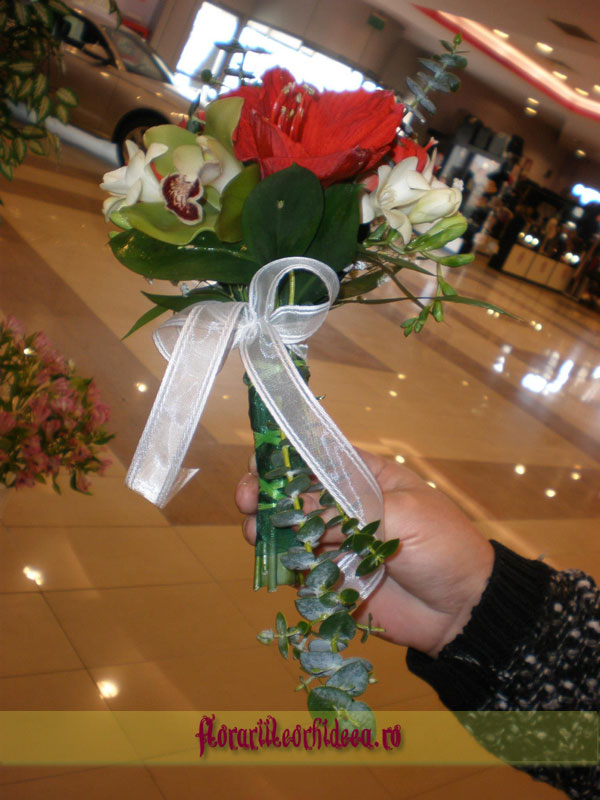 Buchet de nasa din amaryllis rosu, frezii albe si orhidee phalaenopsis verde