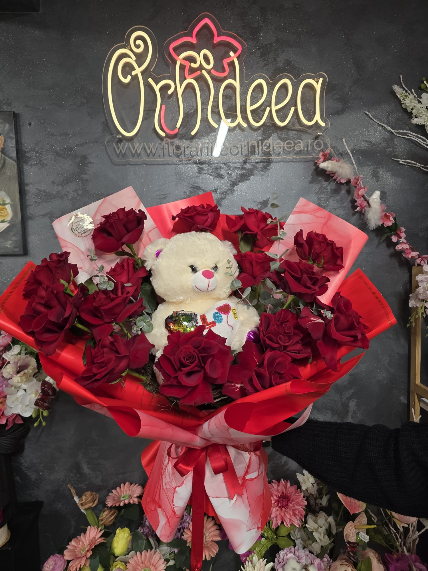 Acest cadou special compus dintr-un ursulet de plus incojurat de trandafiri rosii cu siguranta va fi apreciat!Cu siguranta va aduce zambetul pe chipul ei!