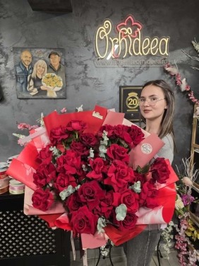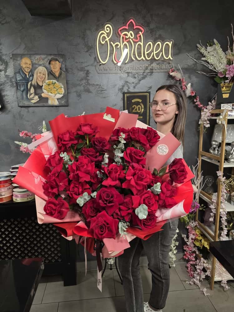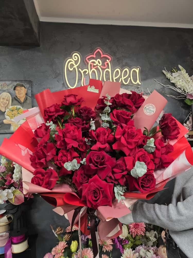 Acest buchet ROMANTIC poate sa contina : 39 Trandafiri rosii Fericiti (adica au petalele intoarse mecanic), 7x Eucalipt, ambalaje si fundita plus o felicitare cadou (inclusa in pret) pentru a scrie mesajul dumneavoastra.