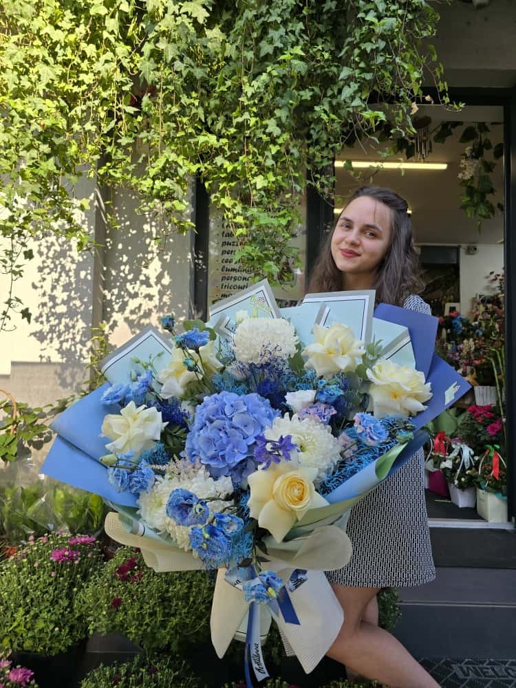 Acest buchet poate sa contina : 1x Hortensie Bleo, 5x Trandafiri Playa Blanca, 6x Lisianthus alb/bleo, 1x Astilbe alb, 3x Crizantema Alba, 4x Limonium Bleo, 2x Limonium Albastru, 4x Eucalipt, ambalaje si fundita plus o felicitare(inclusa in pret) pe care sa notam mesajul dumneavoastra.