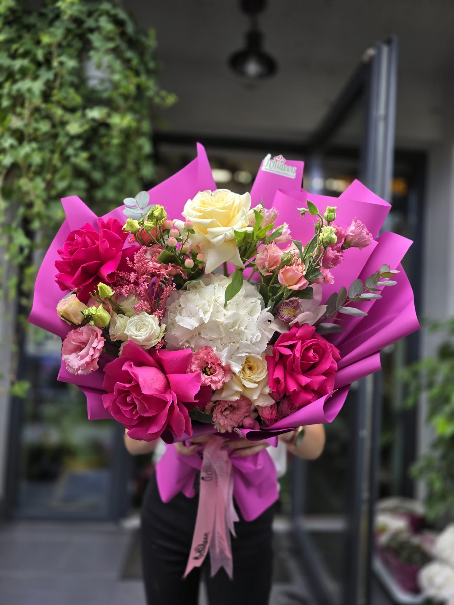 Acest buchet UNIC poate sa contina : 1x Hortensie Alba, 3x Trandafiri Pink Floyd, 2x Trandafiri CandleLight, 2x Miniroza Roz, 1x Miniroza Alba, 4x Lisianthus Roz, 1x Alstroemeria Roz, 1x Hipericum Roz, 1x Solidago Roz, 1x Orhidee Cymbidium Roz, 3x Eucalipt, ambalaje si fundita plus o felicitare(inclusa in pret) pentru a scrie mesajul dumneavoastra!