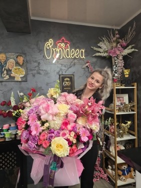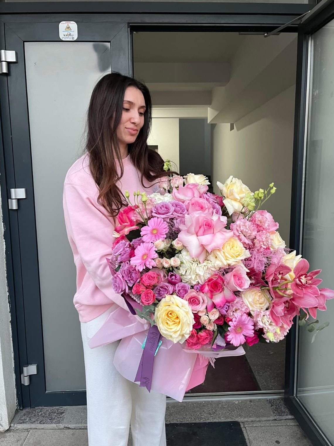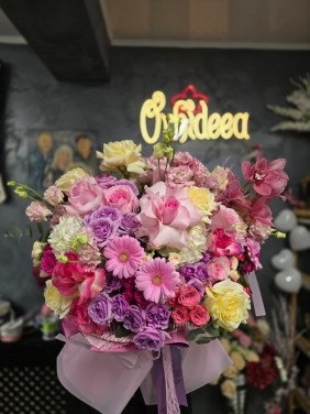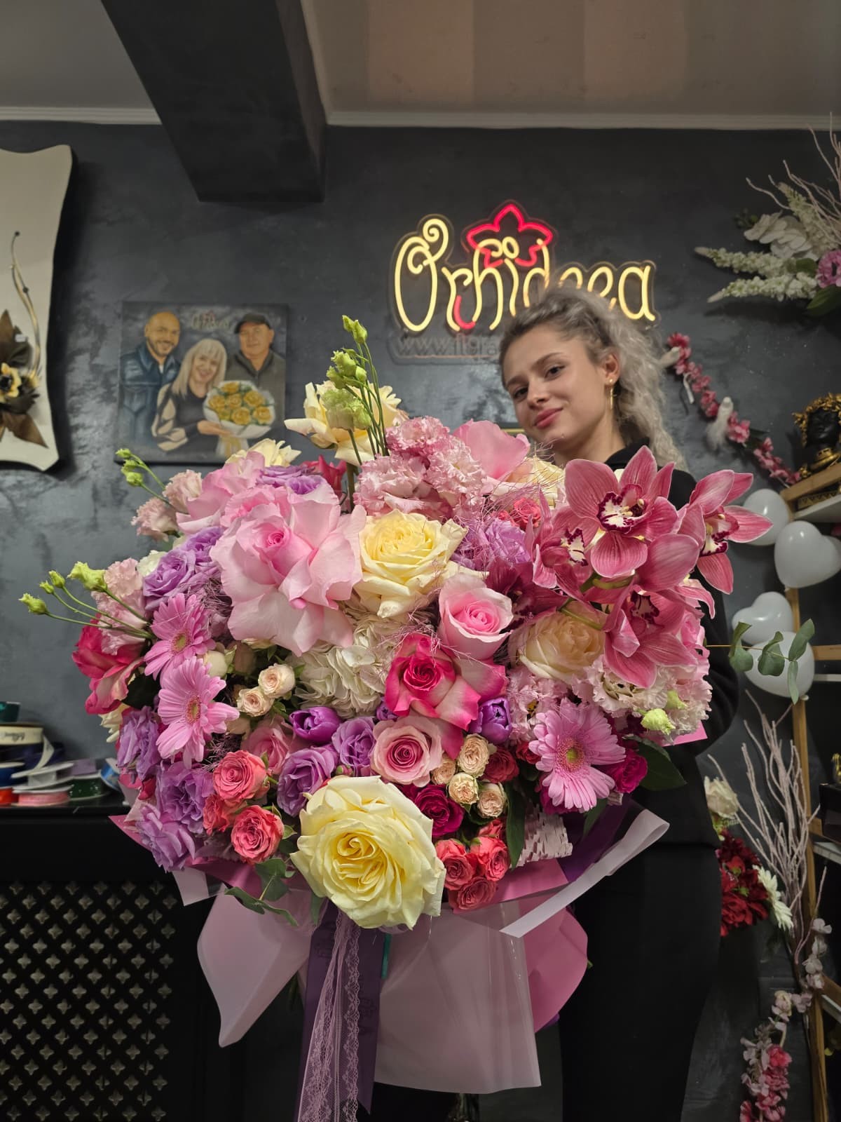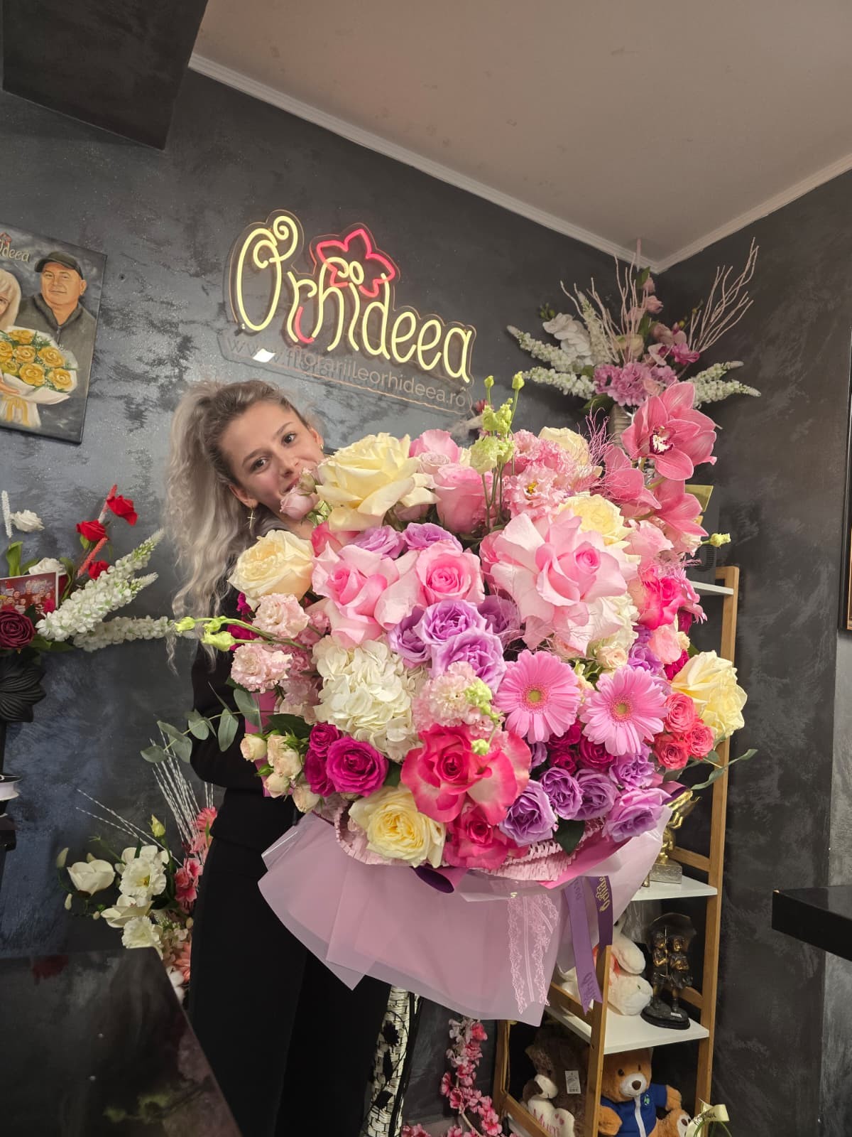 Compozitia include orhidee rafinate, trandafiri catifelati, hortensie bogata, lisianthus delicat, mathiola parfumata, gerbera luminoasa ( pluuus muulte alte flori ) fiecare floare completand perfect ansamblu prin forma, culoare si prospetime. Rezultatul este un buchet luxuriant, aerat si extrem de elegant, ideal pentru cele mai speciale ocazii.