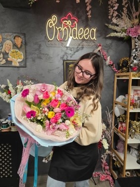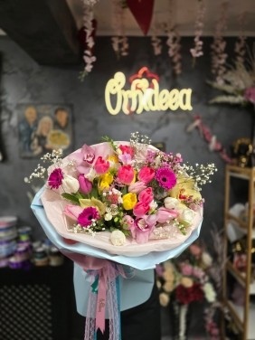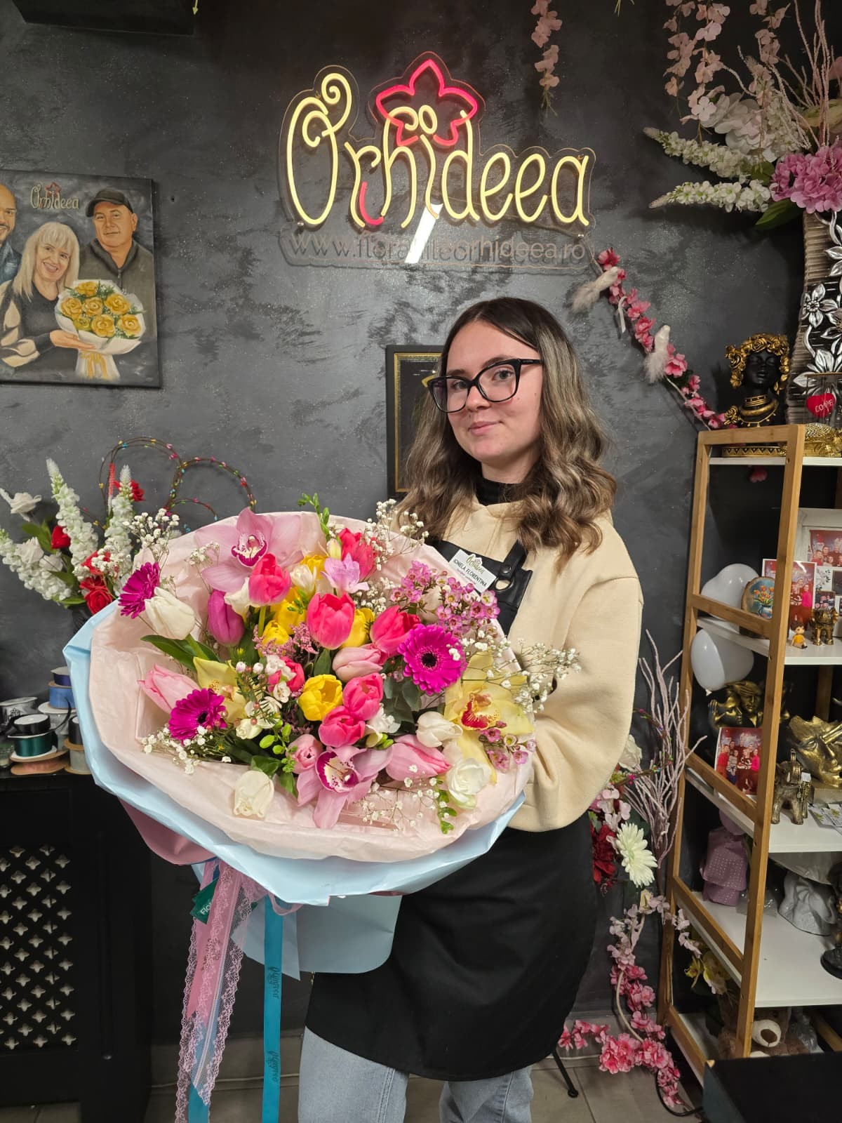 Acest buchet CALDUROS poate sa contina : 11x Frezii multicolore, 17x Lalele multicolore, 3x Gerbera, 4x Cymbidium, 2x Gypshophila, 2x Eucalipt, ambalae si fundita plus o felicitare unde sa notam mesajul tau.