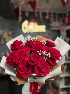 Acest buchet ROMANTIC : 13x Trandafiri Rosii Mari si Fericiti, 2x Gypshophila, ambalaje si fundita plus o felicitare inclusa in pret.