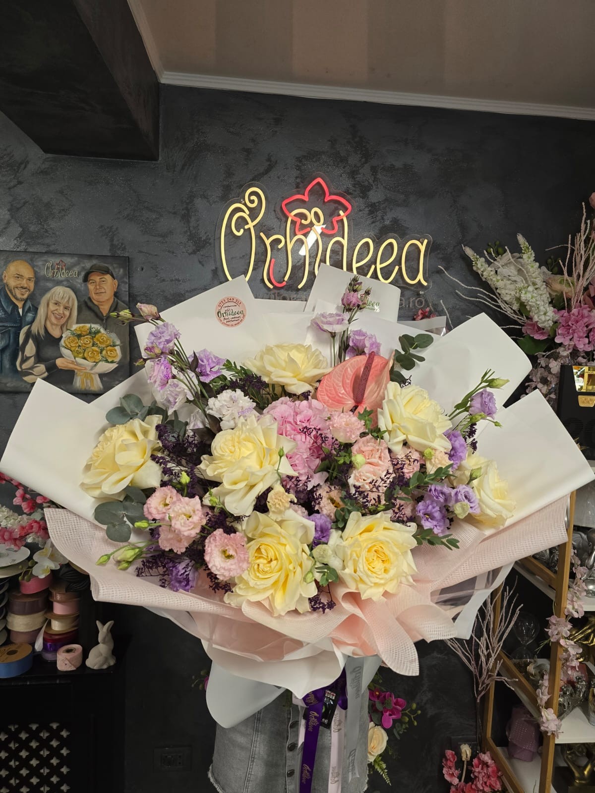 Acest buchet MIRIFIC poate sa contina : 7x Trandafiri CandleLight, 1x Hortensie Roz, 1x Anthurium Roz, 2x Limonium Lila, 2x Lisianthus Roz, 4x Lisianthus Mov, 3x Eucalipt, ambalaje si fundita plus o felicitare(inclusa in pret) pentru a scrie mesajul dumneavoastra.