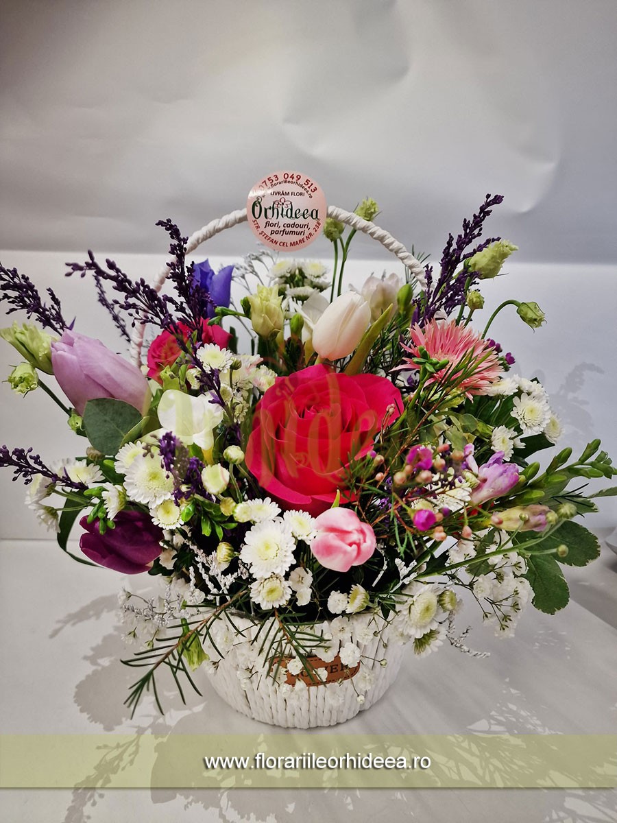 CompoziÈ›ia produsului: frezii, lalele, trandafiri, iris, minigerbera, crizanteme, gipsophila, solidago È™i verdeață decorativă. Dimensiune produs: 29 cm (înălÈ›ime) - 30 cm (diametru aranjamentului)