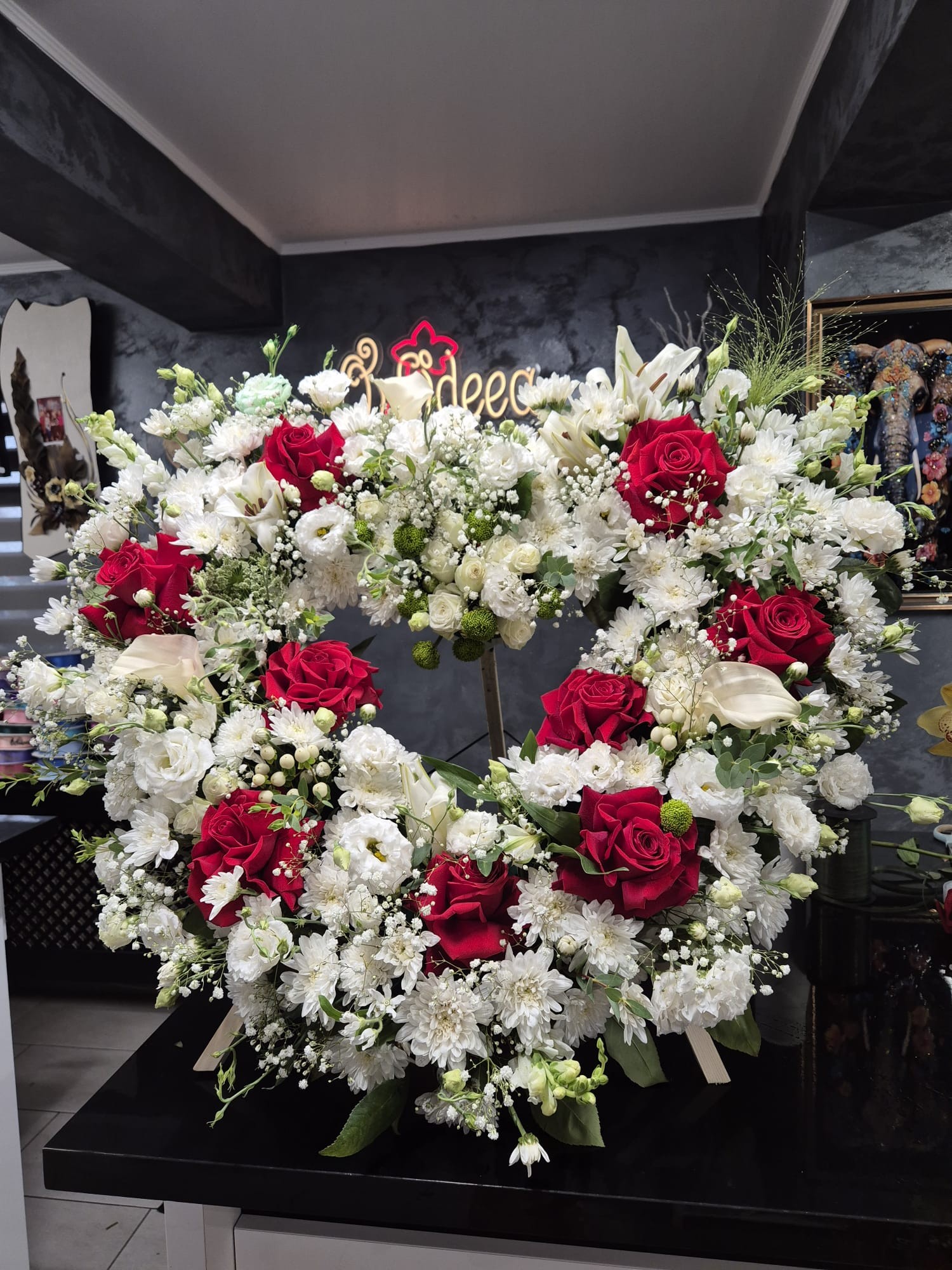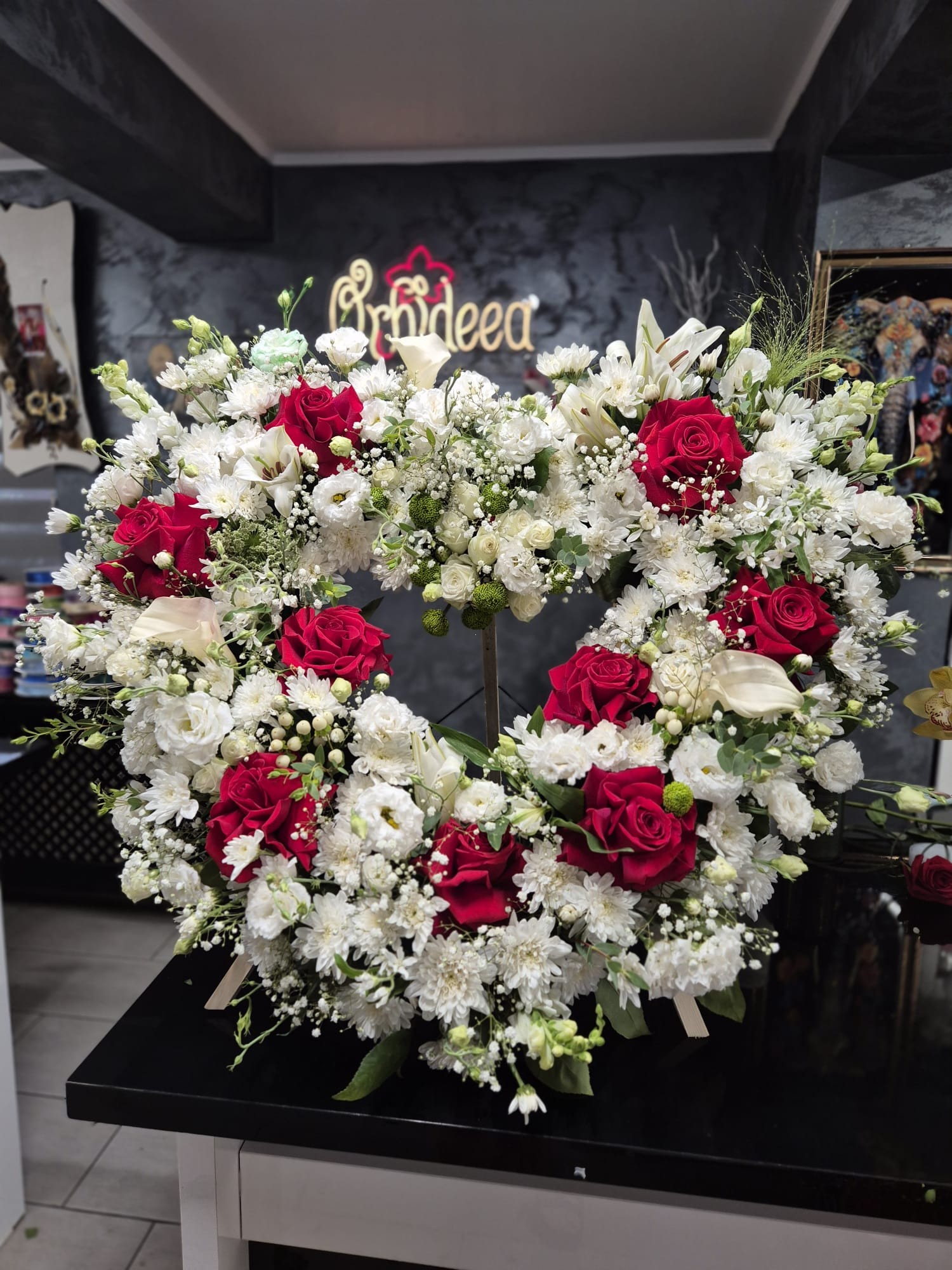 Diametru inima - 80 - 90 cm.Se poate atasa si o banda funerara cu mesaj de condoleante.