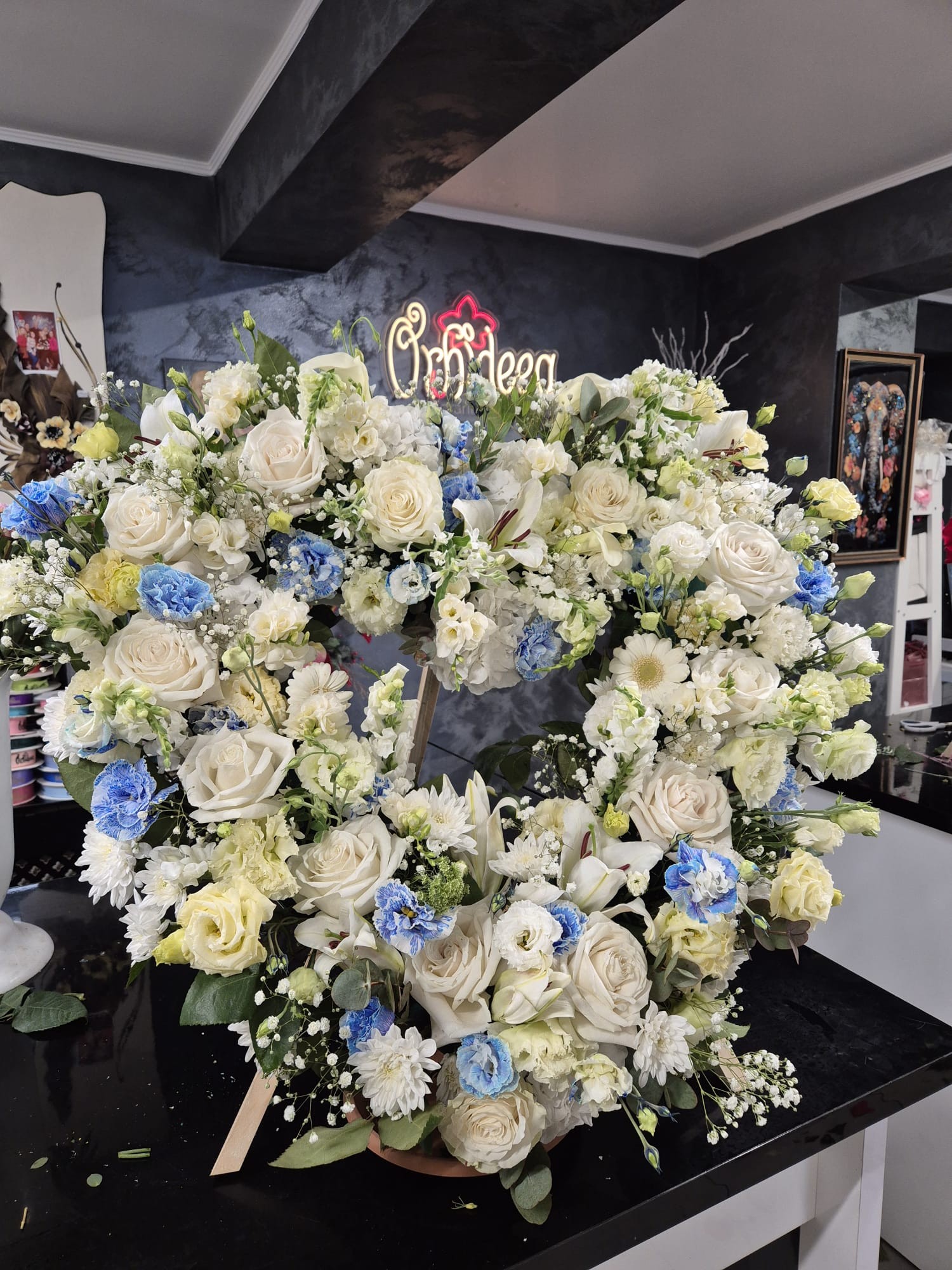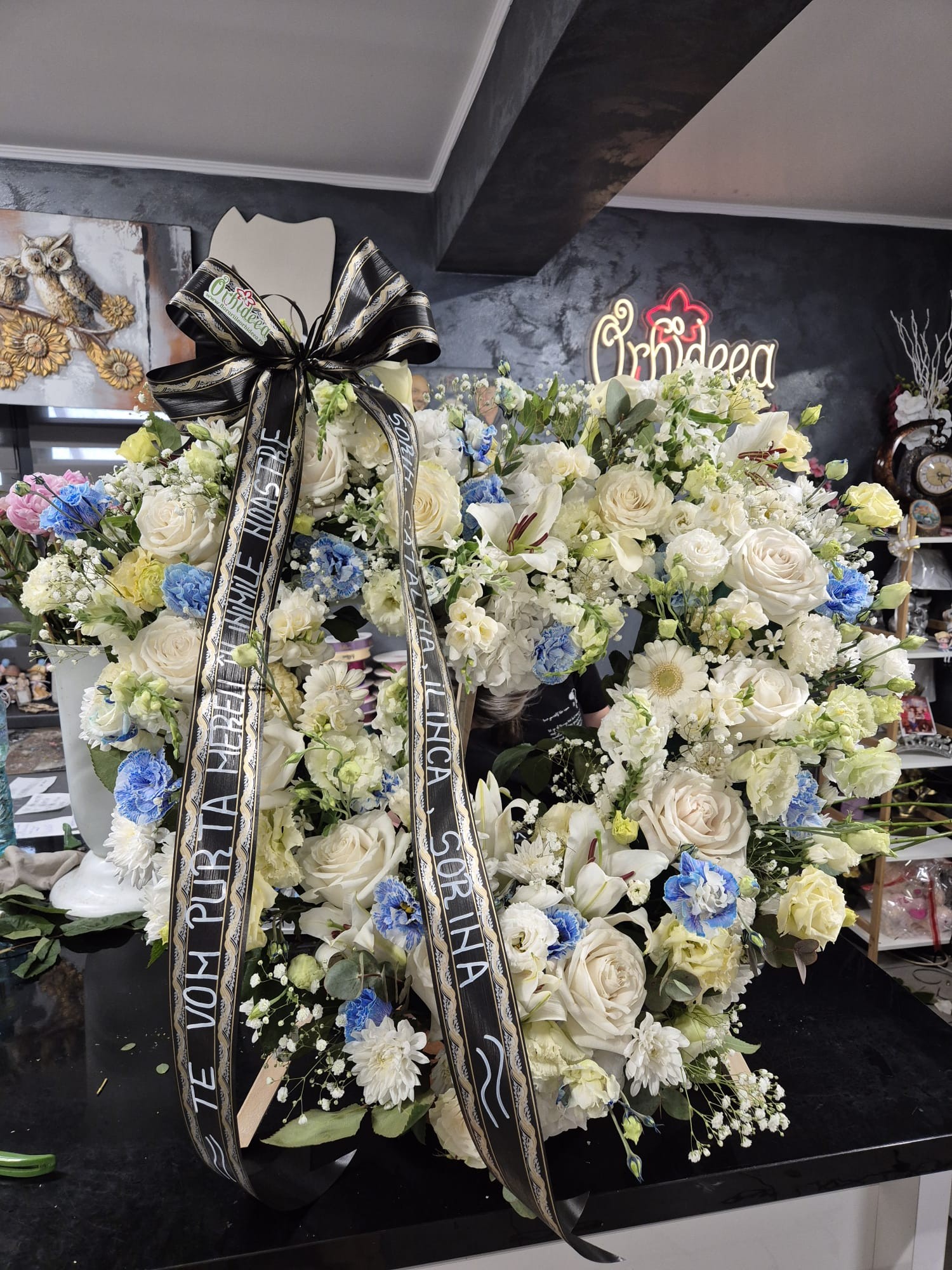 Coroana este realizata manual din flori naturale, fiind potrivita pentru ceremonii funerare si momente de reculegere.