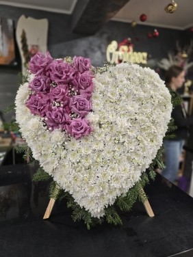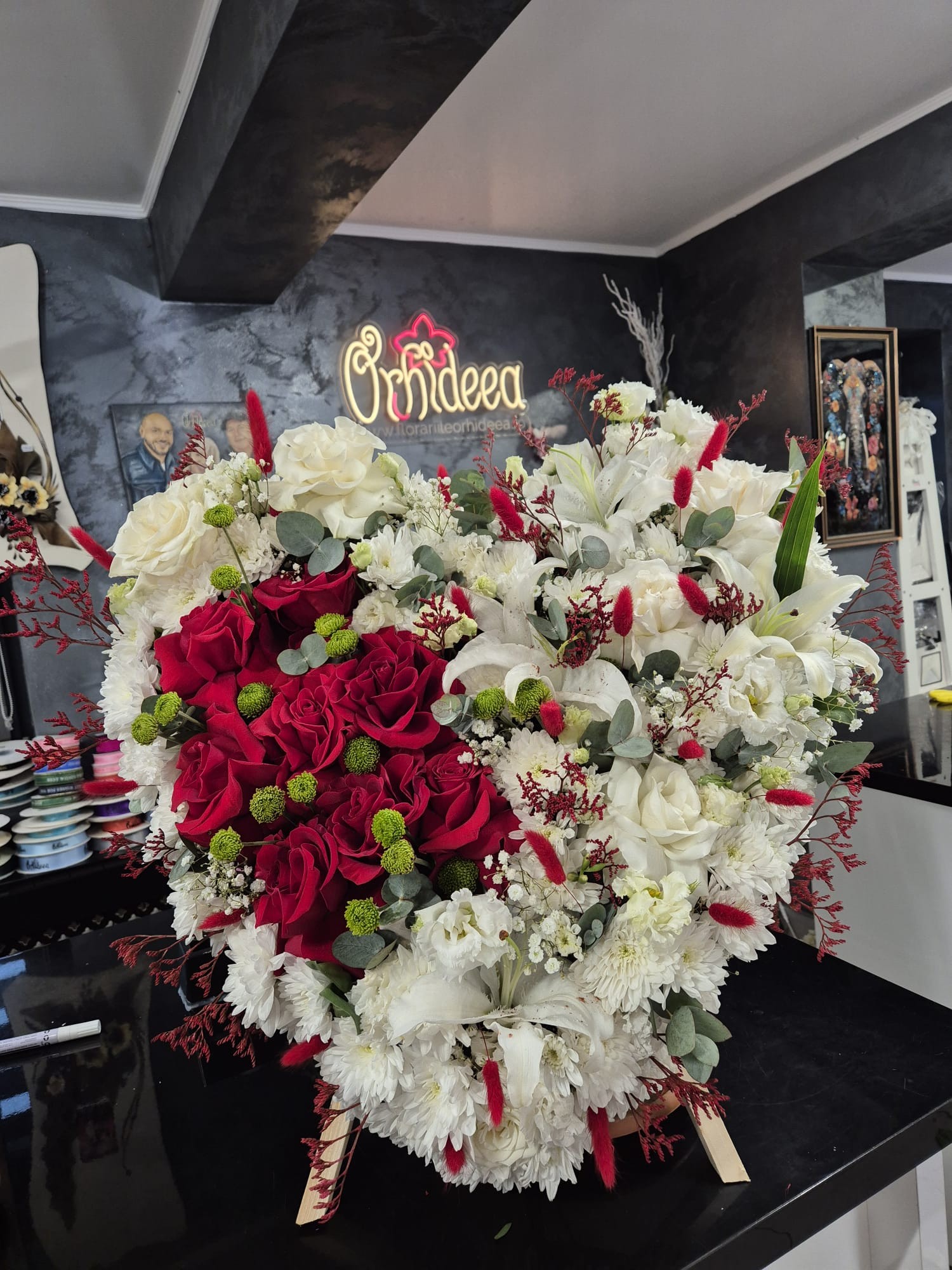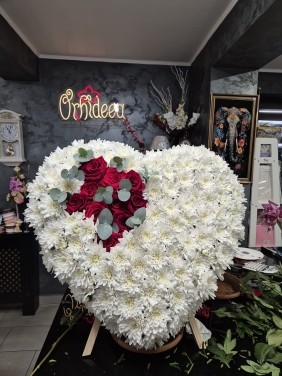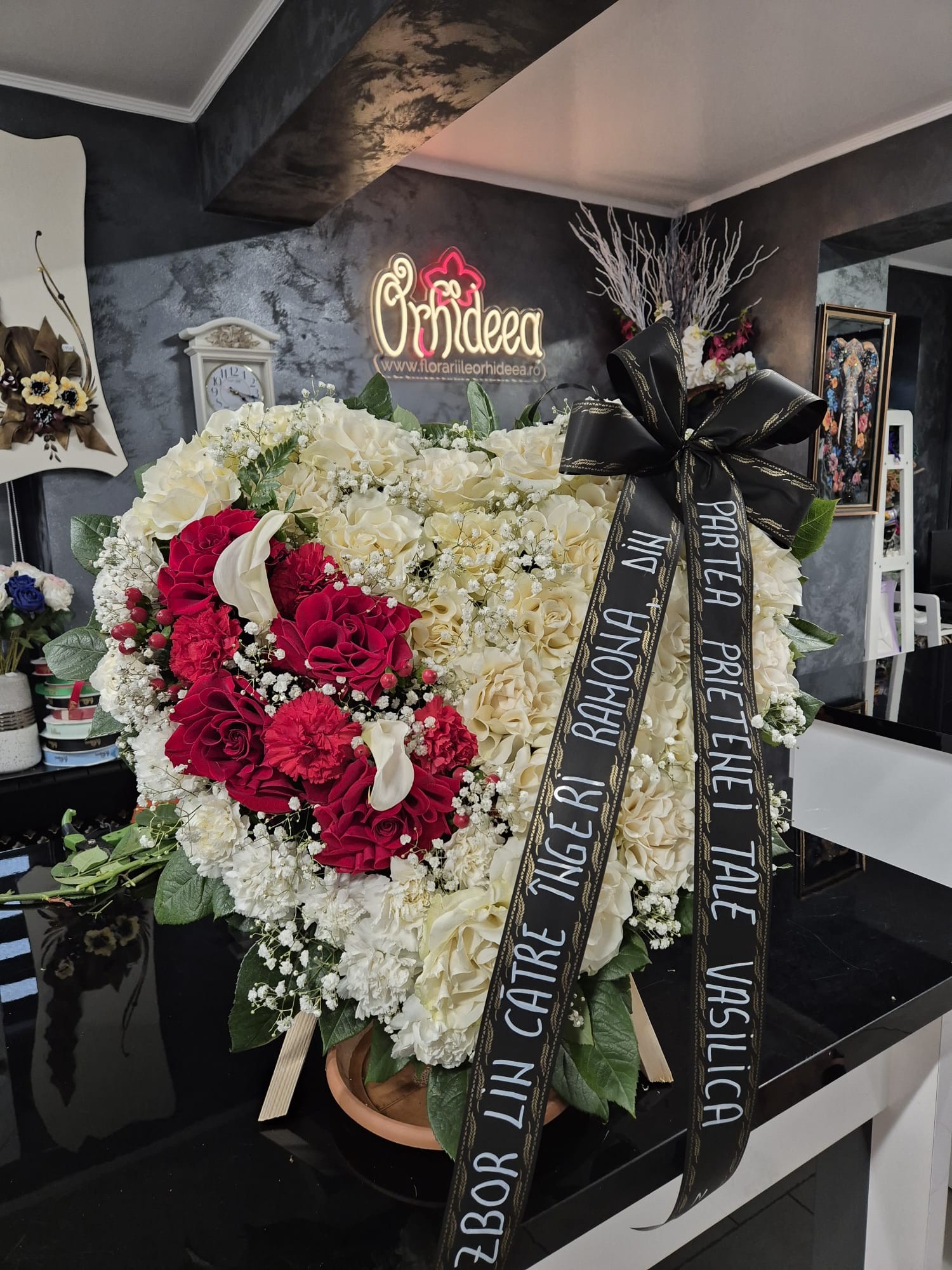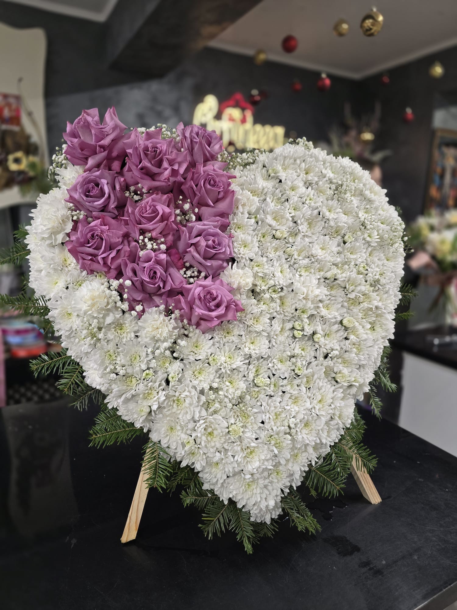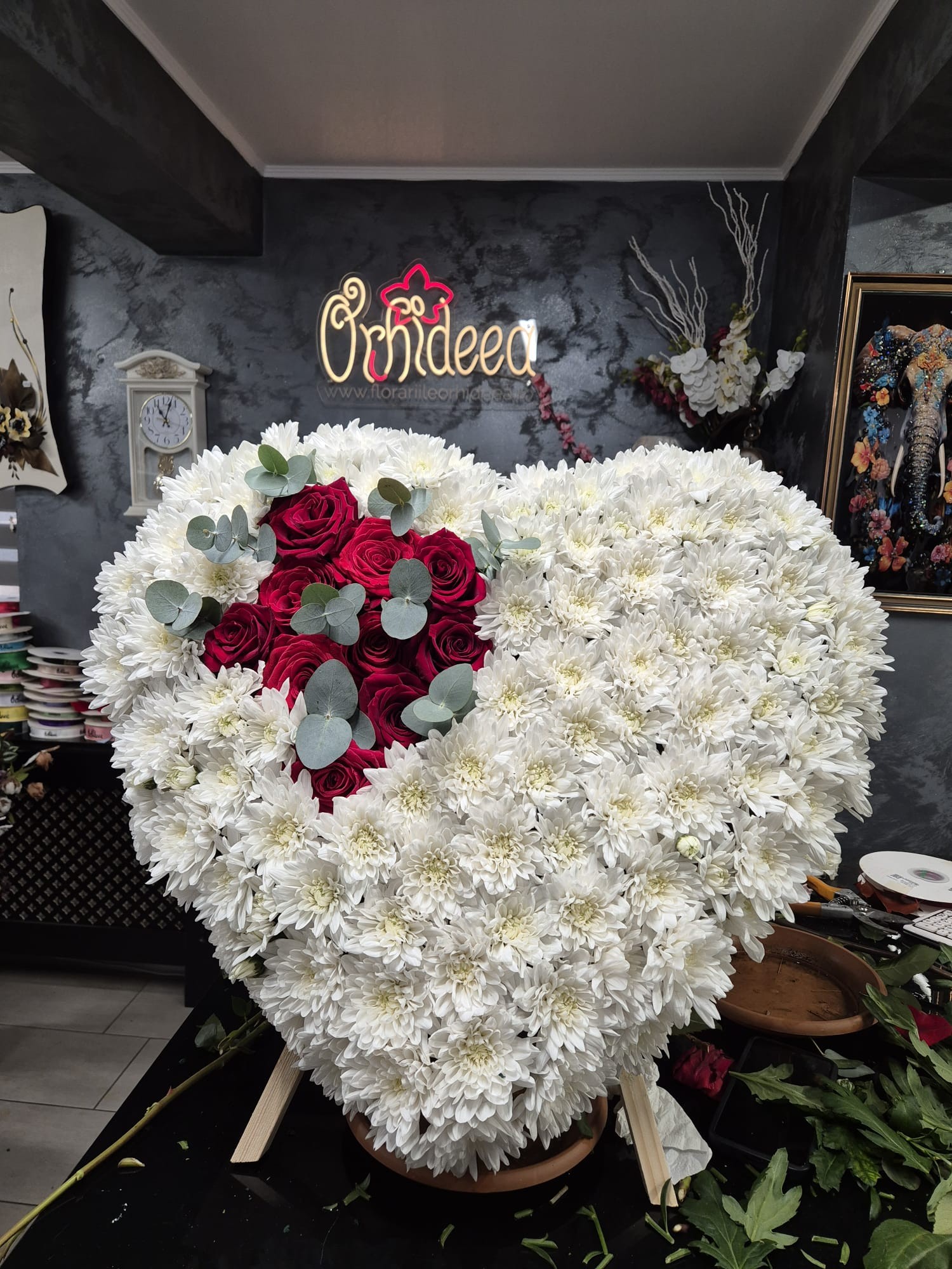Coroana funerara inima plina realizata pe suport de burete cu apa, conceputa pentru a mentine florile proaspete o perioada indelungata.Va arata fresh timp de 4,5 zile fara probleme.