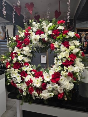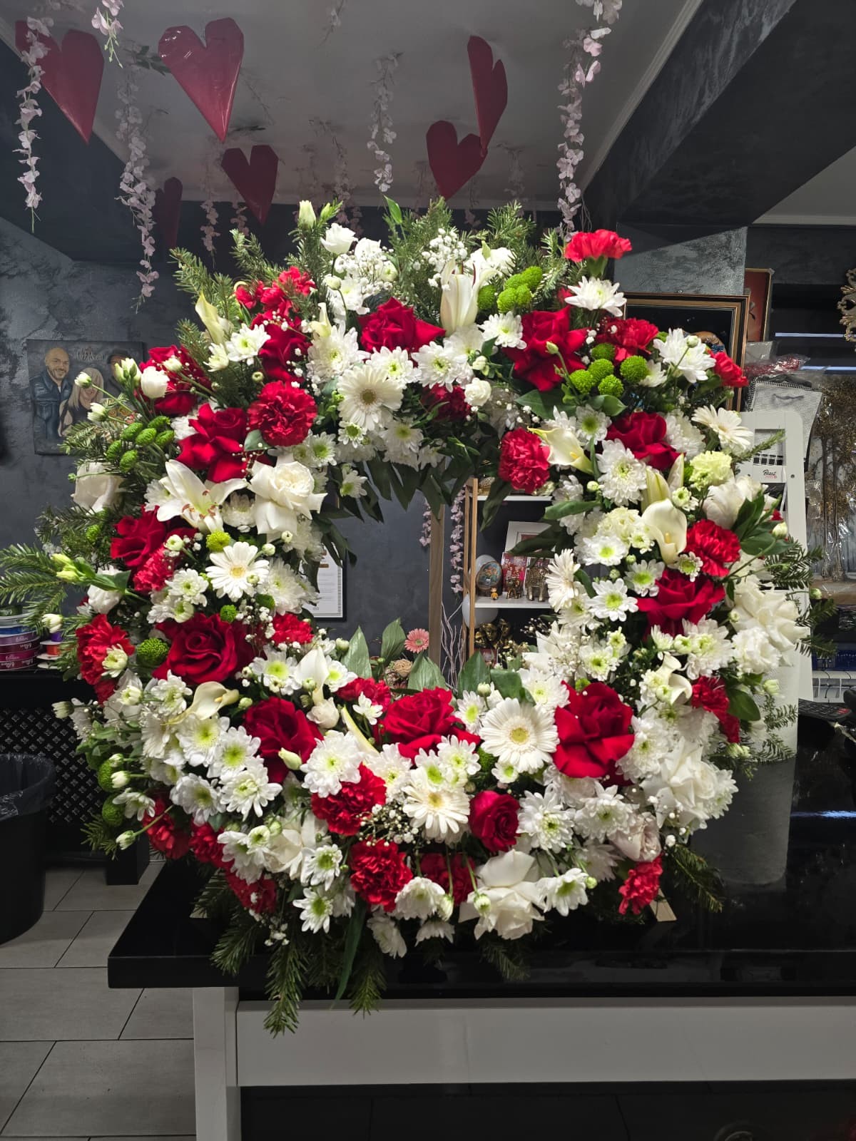 Coroana Funerara rotunda realizata pe suport de burete floral cu apa, conceputa pentru a mentine florile proaspete o perioasa indelungata.