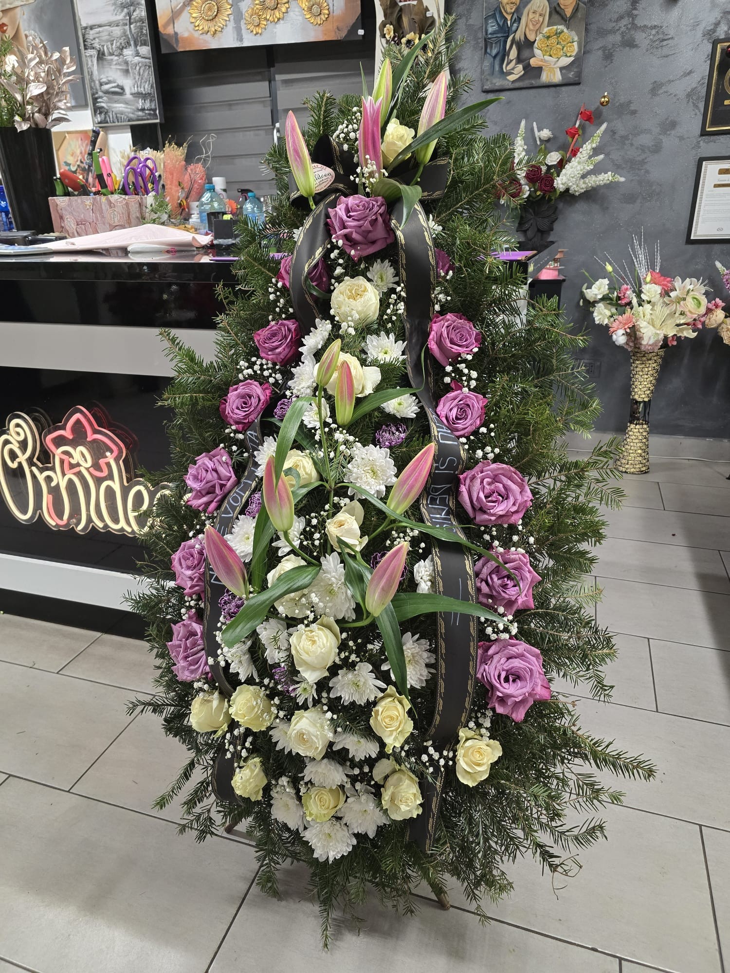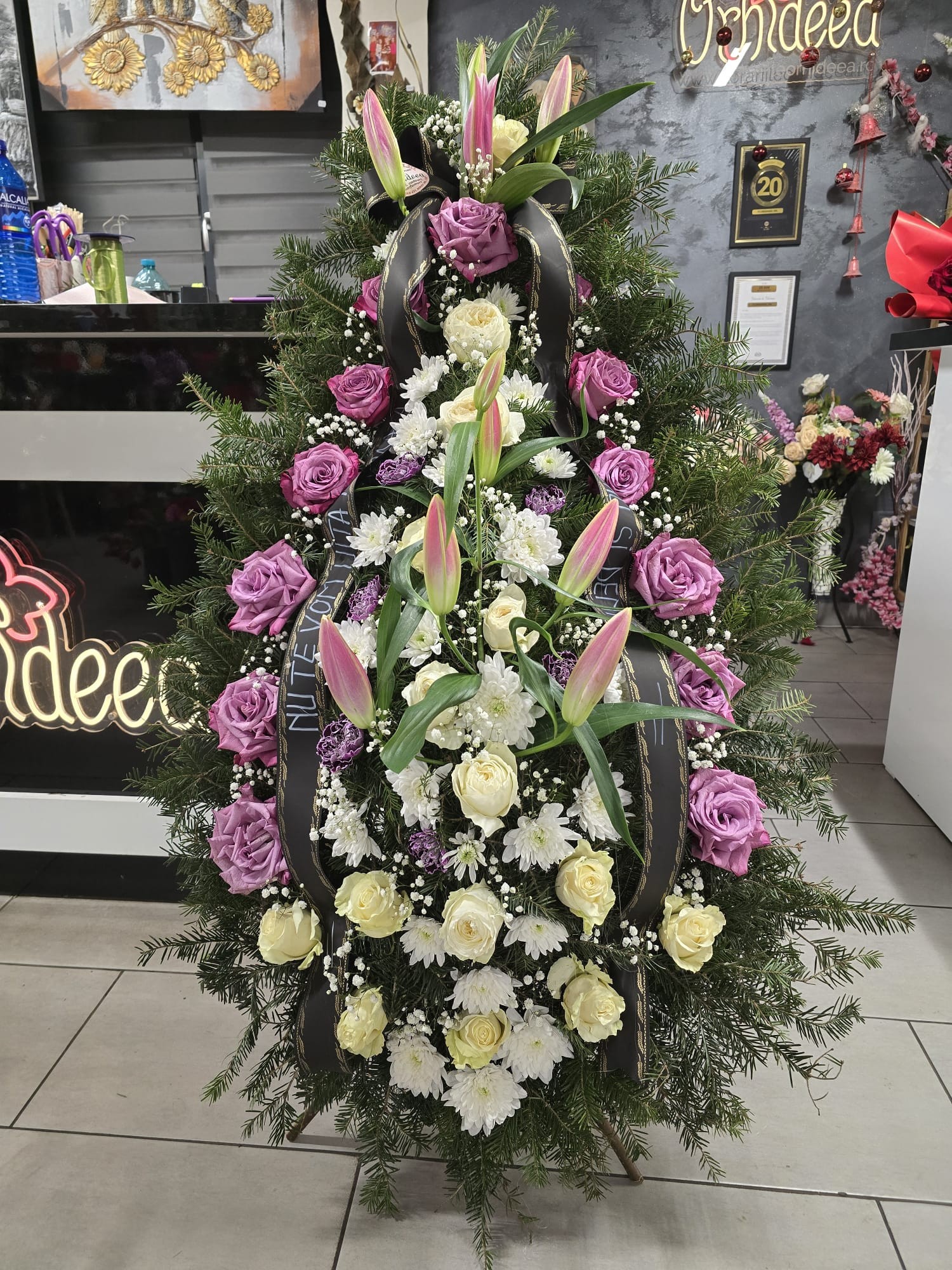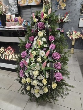 Coroana naturala funerara realizata din ramuri de brad, simbol al eternitatii si al respectului. Aranjamentul floral exte compus din crini eleganti, care exprima puritatea si linistea sufleteasca, trandafiri ce transmit dragostea si recunostinta si crizanteme- flori traditionale ale omagiului si amintiri. Intregul aranjament formeaza un tribut delicat si plin de respect, oferit in semn de adio si pretuire eterna.