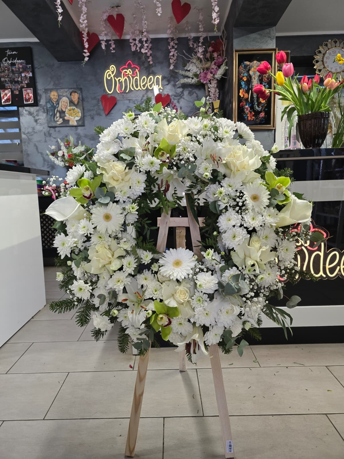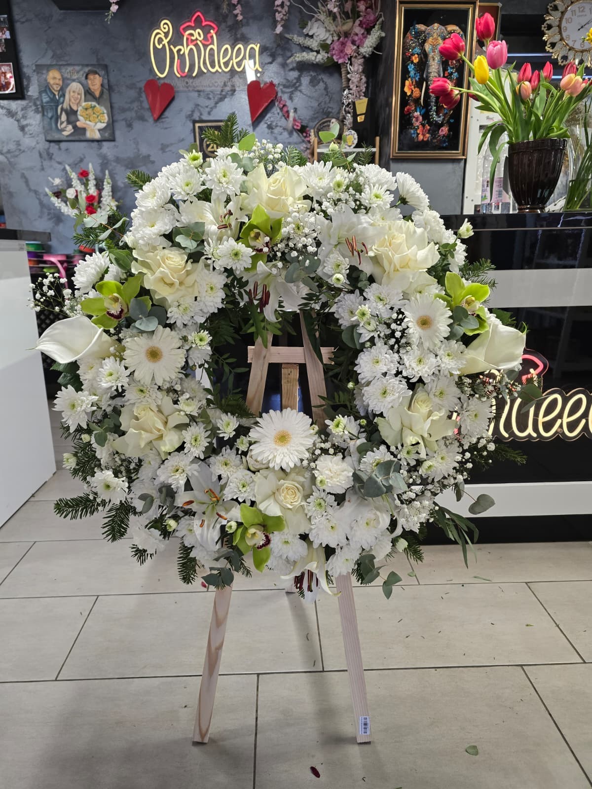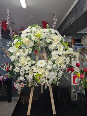 Compozitia include flori atent alese si armonios dispuse pentru a crea un aspect elegant si echiibrat.Florile sunt fixate in burete floral hidratat, care asigura hidratarea constanta si pastrarea prospetimei. O astfel de coroana funerara lucrata doar din flori naturale, va arata fresh timp de minim 3, 4 zile(si pana la 6 zile acceptabil), deci nu va faceti griji din acest punct de vedere.