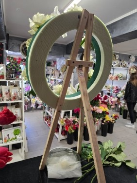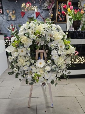 Coroana funerara rotunda realizata pe suport de burete cu apa, conceputa pentru a mentine florile proaspete o perioada indelungata.